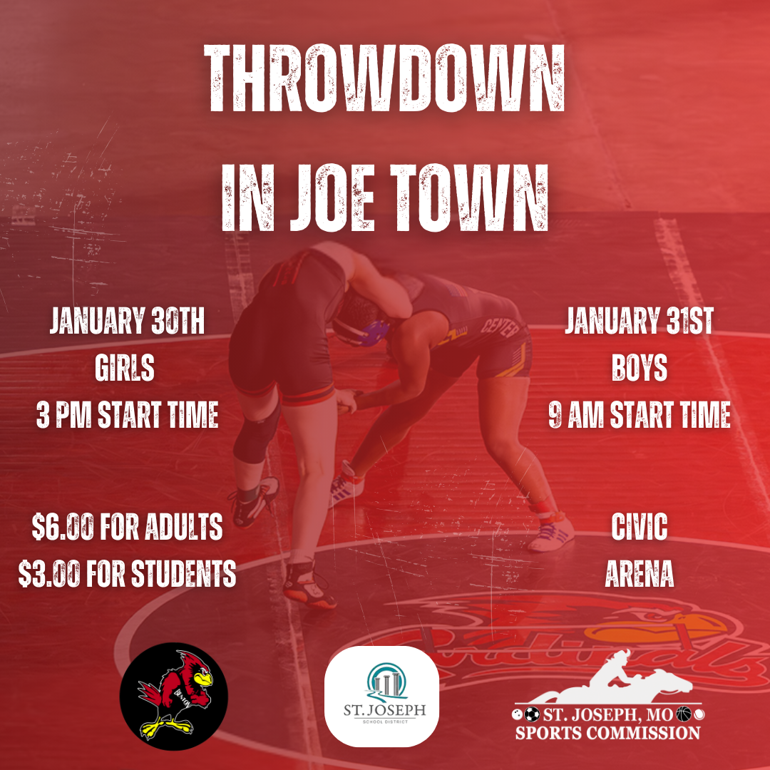 For the second consecutive year, the St. Joseph Sports Commission is proud to partner with Benton High School and the St. Joseph School District for the Throwdown in Joe Town High School Wrestling Event at Civic Arena. 44 teams encompassing nearly 450 wrestlers will converge on downtown for a crucial meet right before the beginning of district action! The girls draw begins Friday, January 30 at 3 PM with weigh-ins set to take place at 1:30 PM while boys action is set for Saturday, January 31 at 9 AM with weigh-ins at 7:30 AM.